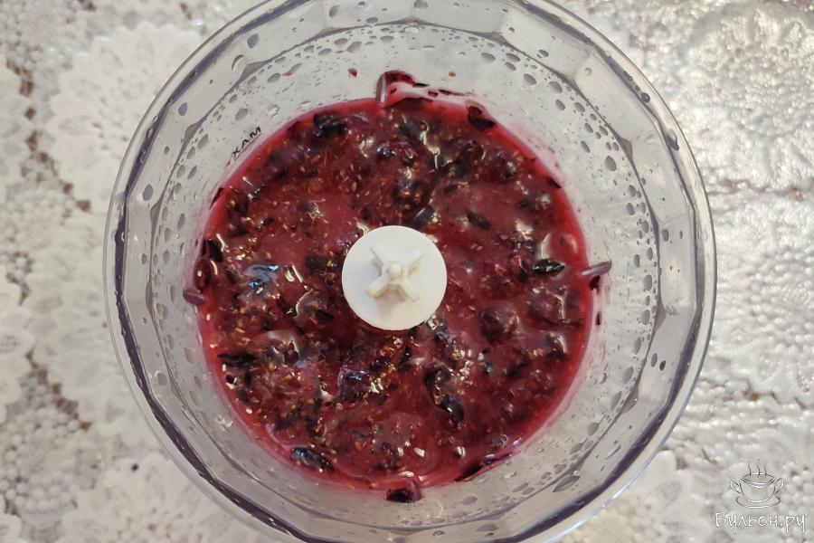 3. Частями отправить смородину в чашу блендера, перемолоть не слишком долго, чтоб получилась кашица из ягод.
