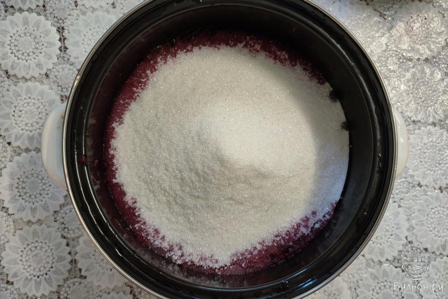 4. Всю перемолотую смородину переложить в кастрюлю, где будет вариться варенье. Добавить сахарный песок, хорошо перемешать.