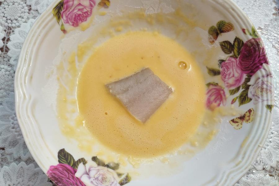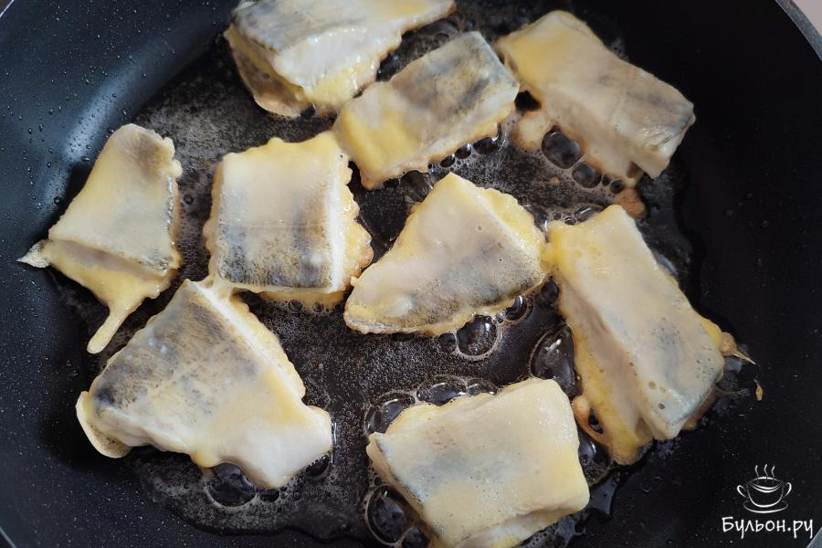 4. Выложить куски судака на разогретую с маслом сковороду. Обжарить с двух сторон до золотистого цвета. Жарить под крышкой по 3-4 минуты с каждой стороны.