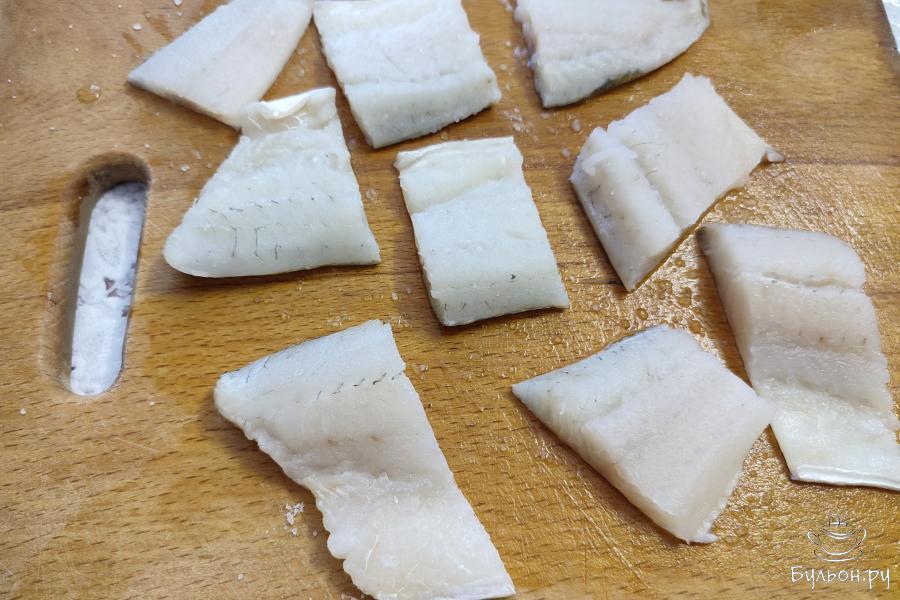 1. Рыбу почистить, удалить хребет и кости. Нарезать на кусочки. Можно использовать готовое филе судака, в магазинах такое продается. Кусочки рыбы обсушить, посолить.