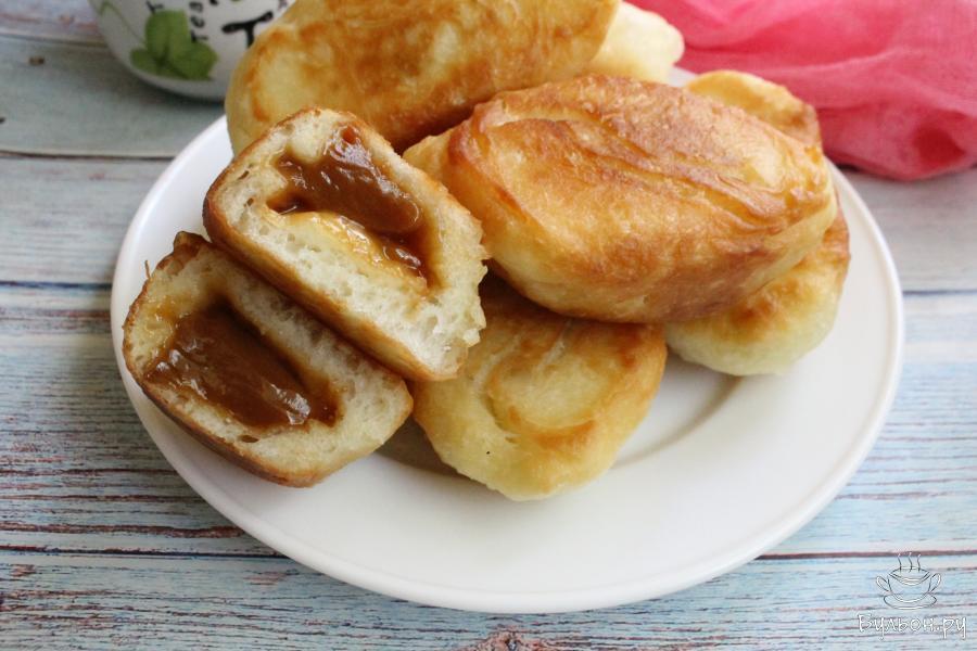 10. Пока пирожки горячие, то сгущенка в них жидкая, текучая, карамельная. Хотя холодные они тоже вкусные. Приятного чаепития!