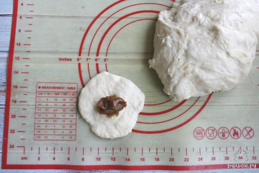 7. Отщипываем от теста одинаковые кусочки, разминаем их руками в лепешечку толщиной около 0.5 см. Выкладываем на один пирожок 1 ч. л. вареной сгущенки. Тщательно защипываем края пирожков.