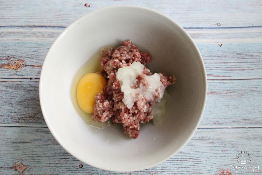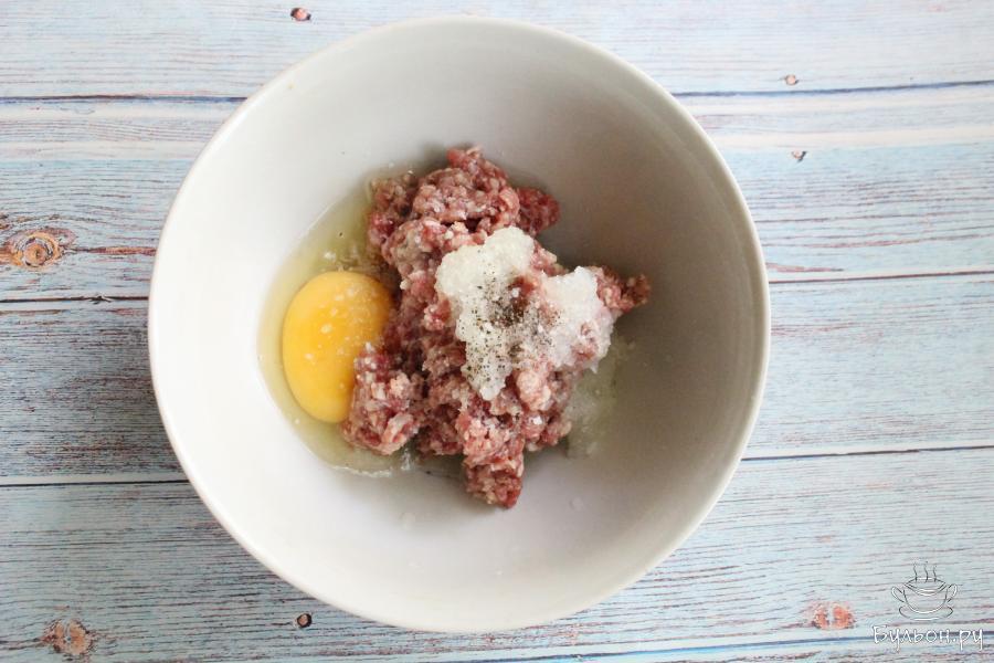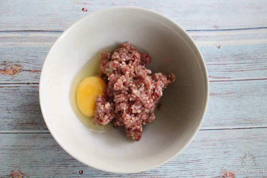 1. Готовый фарш размораживаем. Если готового фарша нет, то перекручиваем мясо через мясорубку с мелкой решеткой. Добавляем в фарш яйцо.