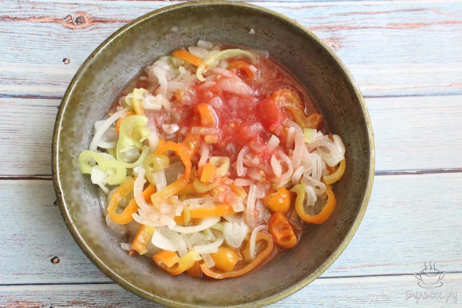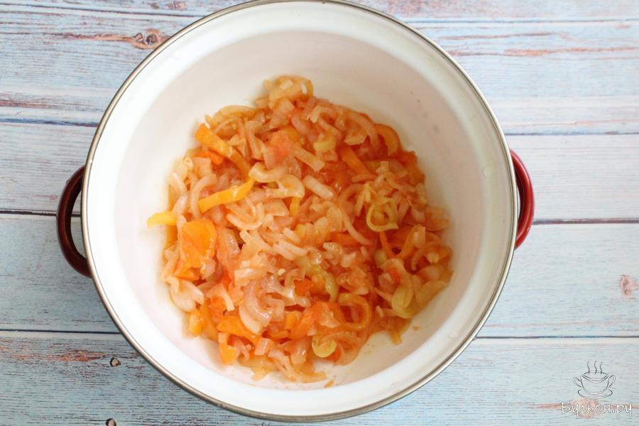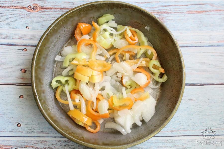 1. Лук и перец чистим, промываем и мелко нарезаем. Тушим овощи на сковороде с разогретым маслом 3-4 минуты.