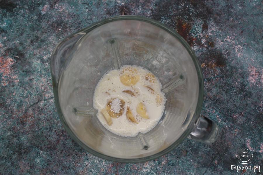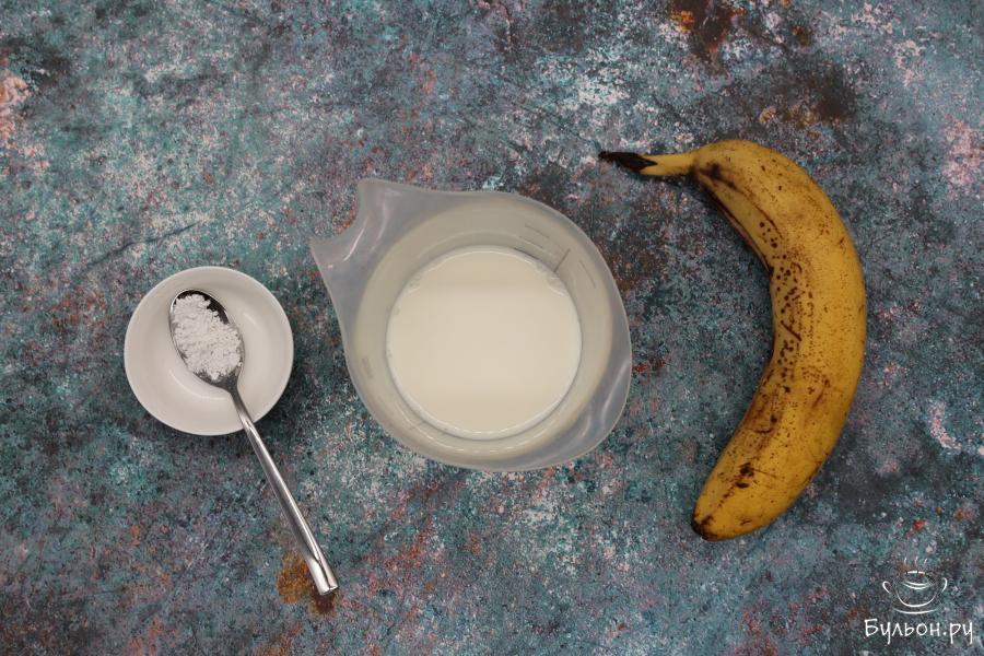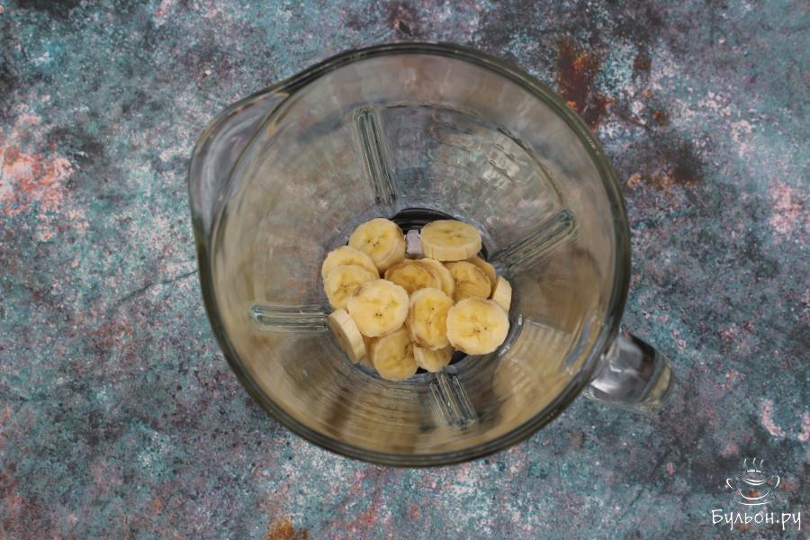 2. Банан берем тот, который уже немного потемнел, поскольку такие бананы более сладкие, соответственно и молоко с такими бананами будет вкуснее. Банан очистим от кожуры, нарежем его на кусочки. Положим все в блендер.