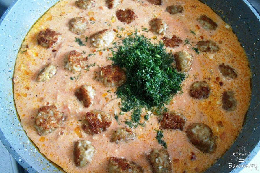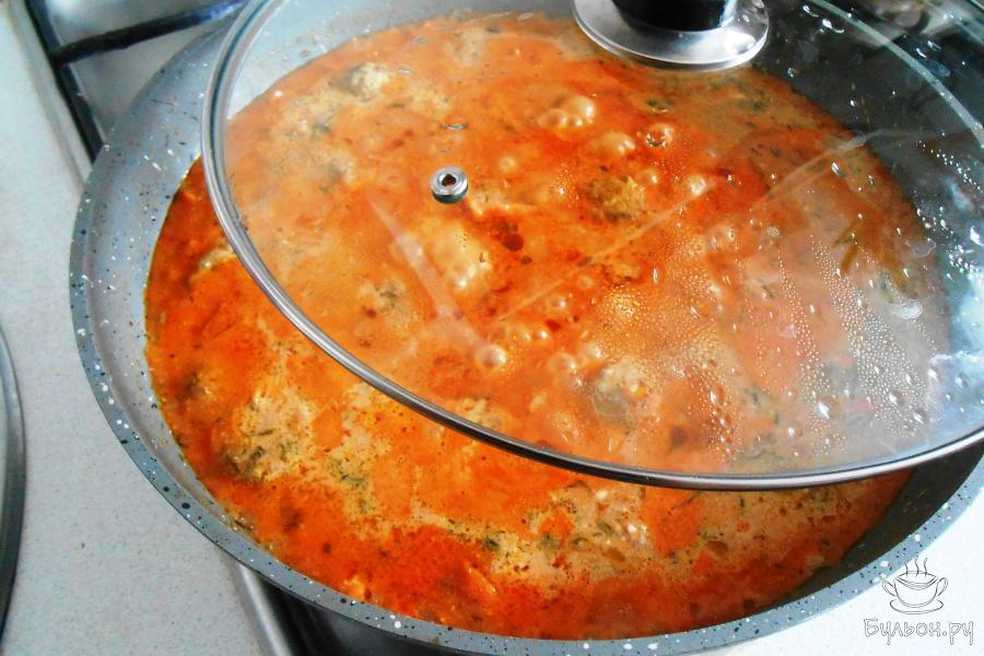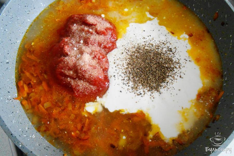 11. Добавить сметану, томатную пасту и воду, посолить и поперчить по вкусу. Перемешать и довести до кипения.