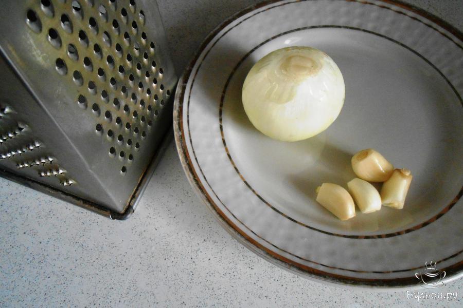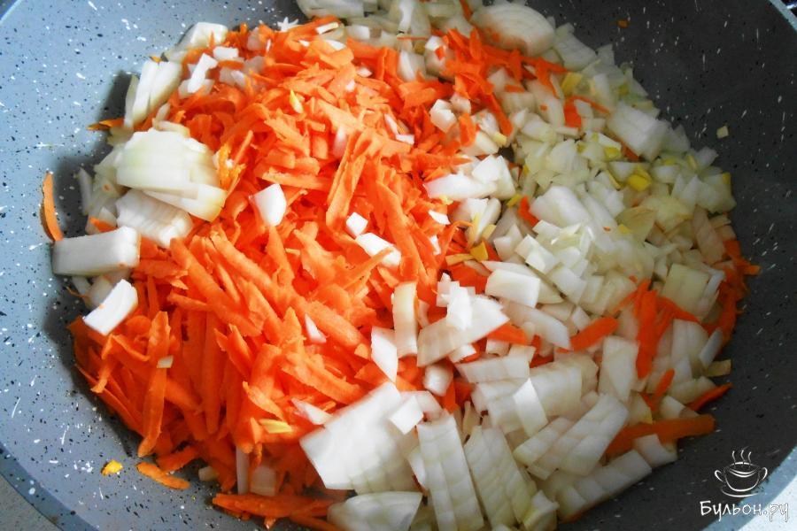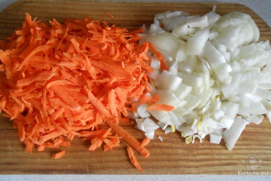 9. Оставшийся лук и морковь почистить и помыть. Морковь натереть на крупной терке, лук нарезать кубиками.