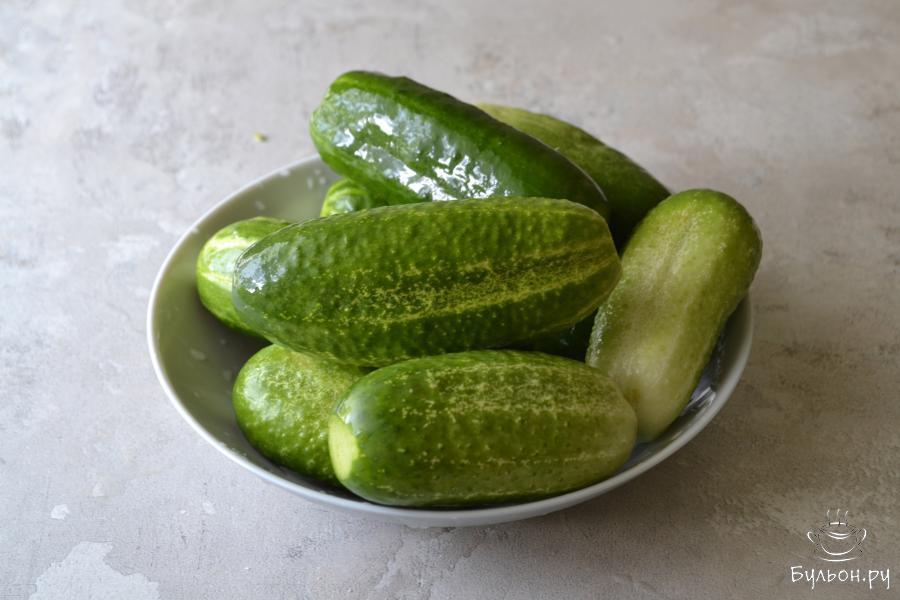 1. Свежие огурчики небольшого размера тщательно промойте. Если время позволяет, то залейте их холодной водой на час-полтора. Отрежьте кончики у огурцов.