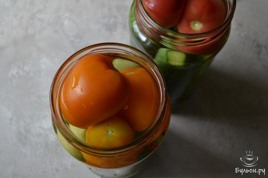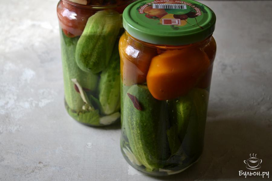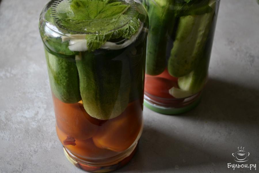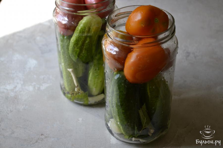 Ассорти из помидоров и огурцов - это вкусная домашняя заготовка, в которой могут сочетаться сезонные овощи: помидоры, огурцы, сладкий перец, патиссоны, морковь, капуста, репчатый лук. Кроме того, что такая баночка красиво выглядит, это еще очень удобно и практично. В одной баночке весь набор овощей, который прекрасно подойдет для мясных блюд, как дополнение практически к любым гарнирам или просто, как закуска на любой вкус. Количество ингредиентов дано на 2-литровую банку. Количество помидоров и огурцов приблизительное, зависит от размера овощей. Главное, чтобы банка была плотно заполнена.