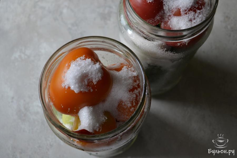 7. Вскипятите воду. Через 20-25 минут воду из банок слейте в раковину и всыпьте сахар и соль в банки, влейте уксусную эссенцию.