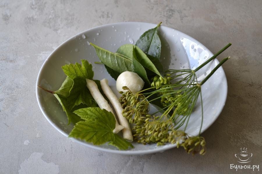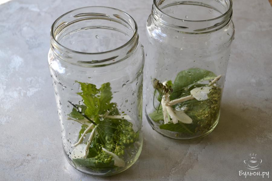 4. Банки и крышки промойте с содой. Крышки прокипятите, банки стерилизуйте над паром или в духовке. На дно банок положите промытую зелень, перец чили, корень хрена разрежьте соломкой, чеснок нарежьте кружочками. Если не любите острое, то перец можно не добавлять.