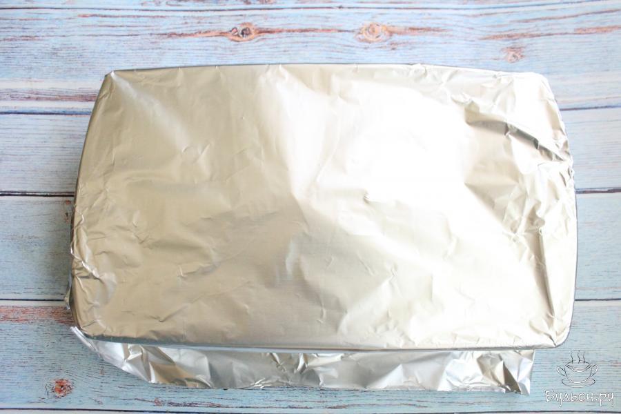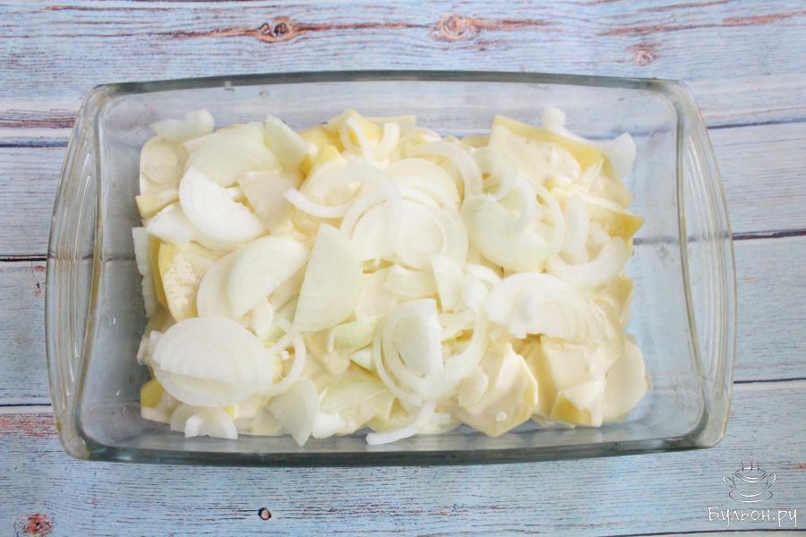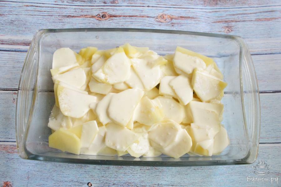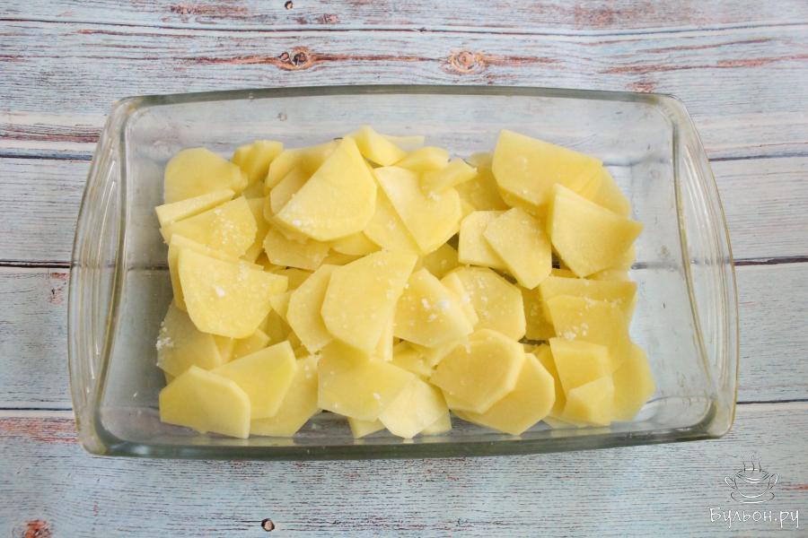 3. Форму для запекания смзываем маслом. Картофель чистим, моем, тонко режем и выкладываем в форму. Немного солим картофель.