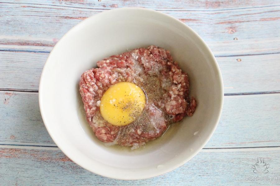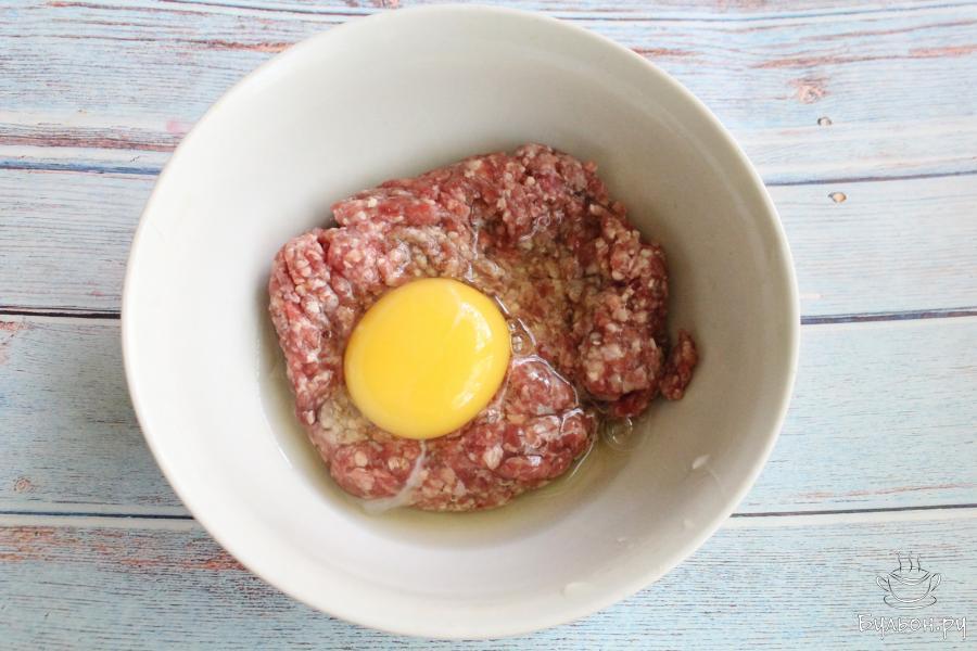 1. Фарш размораживаем. Если готового фарша нет, то прокручиваем мясо через мясорубку. Добавляем к фаршу яйцо.