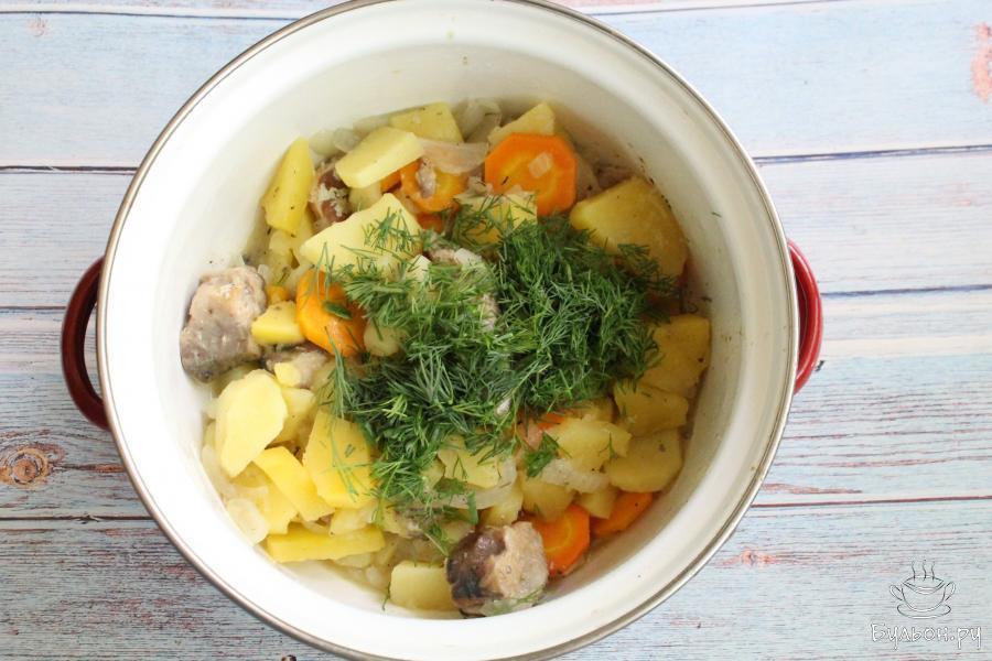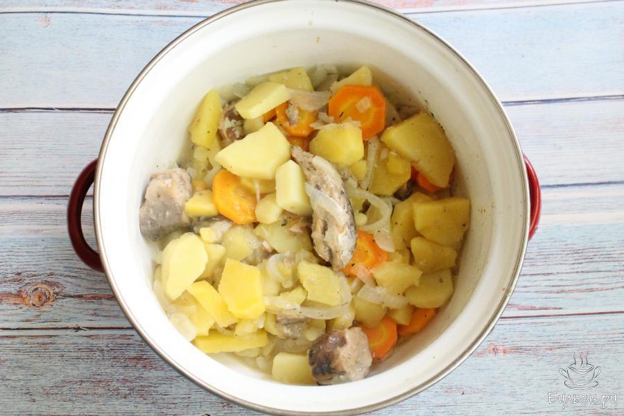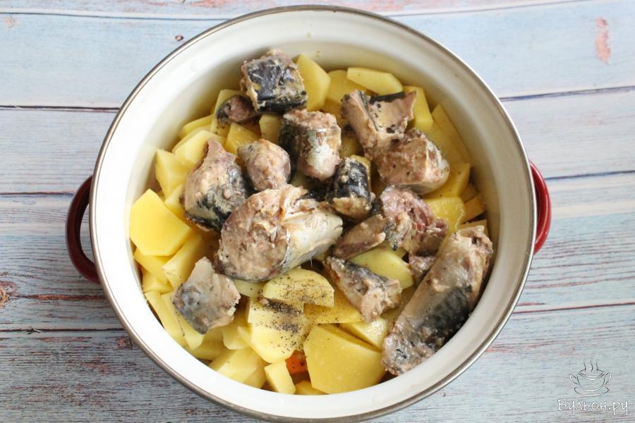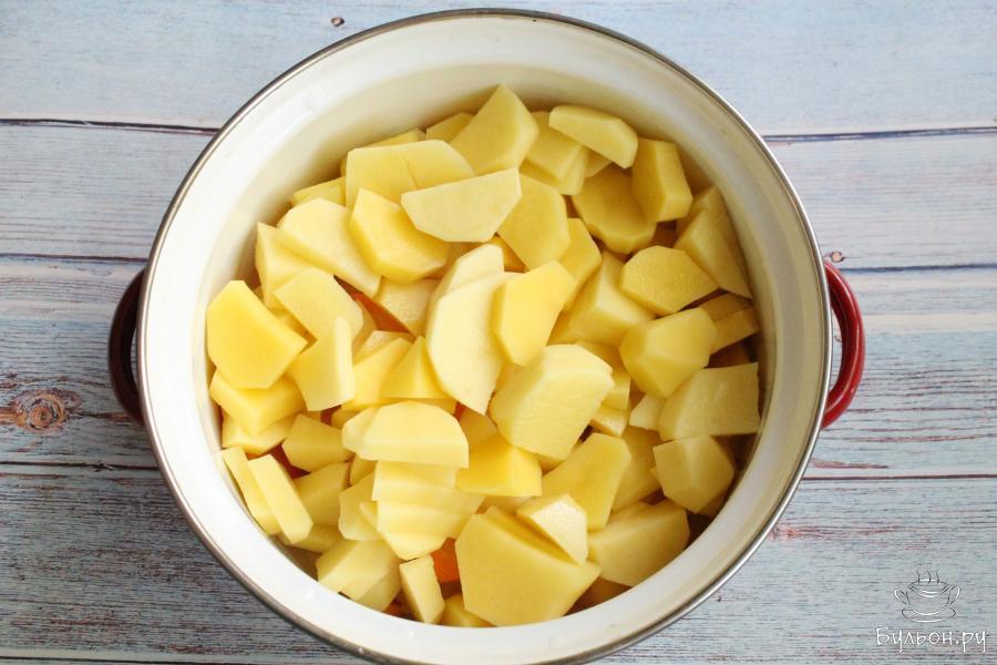 3. Картофель почистим, промоем и нарежем тонкими полукружочками. Выкладываем картофель на морковь, добавляем соль и черный перец.