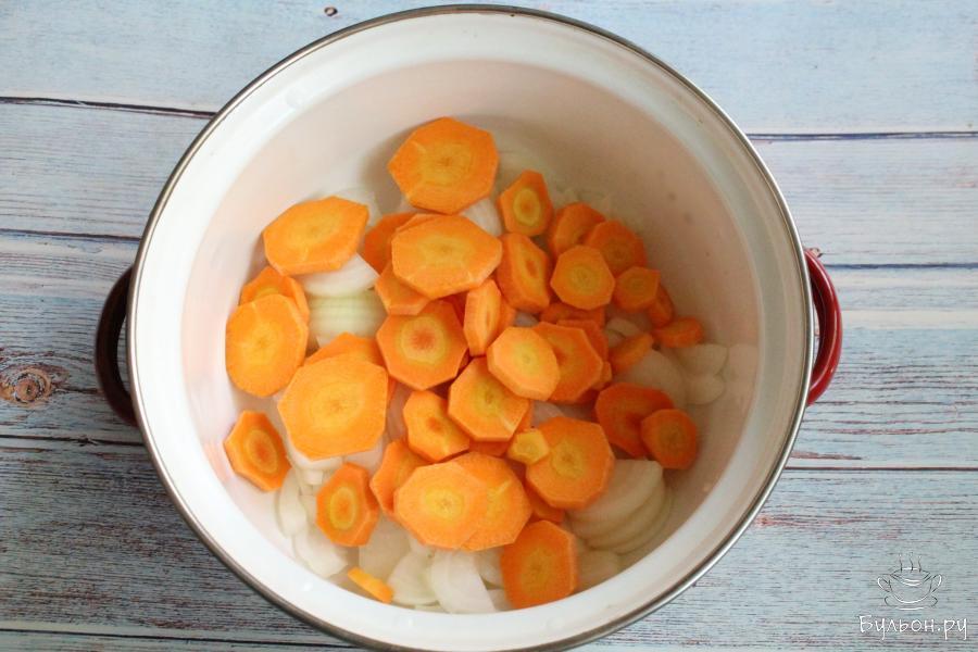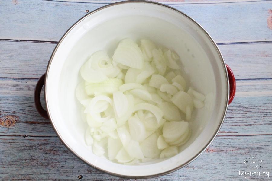 1. Лук почистим, промоем и нарежем не очень тонкими полукольцами. Укладываем лук в кастрюльку или казанок.