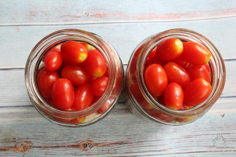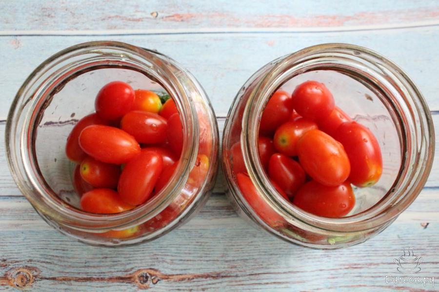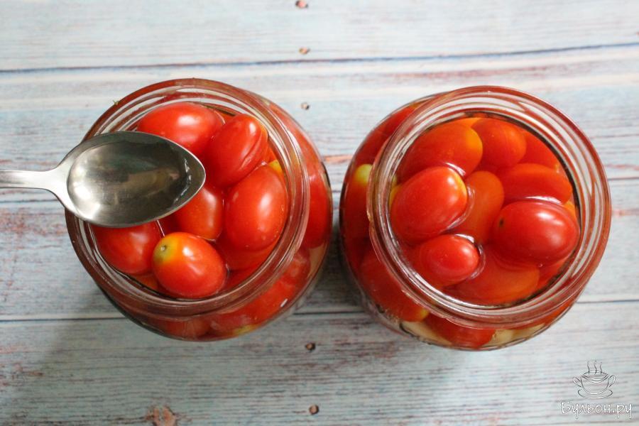 8. С помидоров сливаем воду. Заливаем заготовку кипящим маринадом и добавляем уксус, непосредственно в баночки.