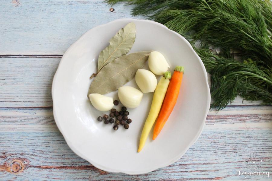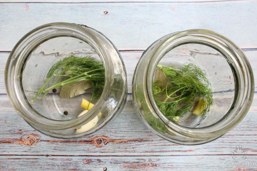3. Две литровые банки хорошо моем. Выкладываем в баночки перец горошком, лавровый лист, чеснок, по паре веточек укропа. Острый перец режем на несколько частей и добавляем по своему вкусу и вкусу перца, если перец очень острый, то можно уменьшить количество.
