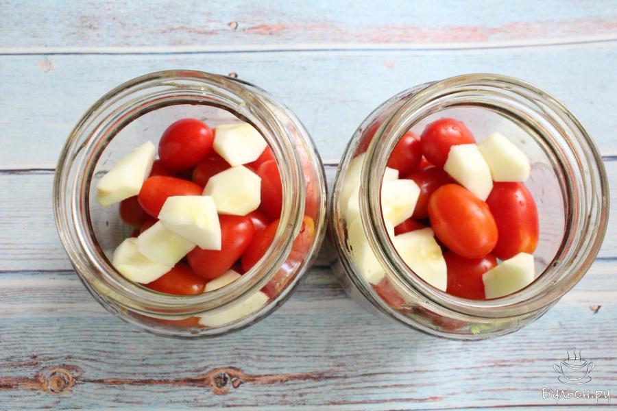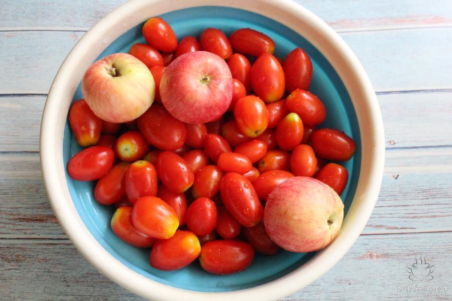 Консервированные помидоры черри с яблоками, порадуют вас зимой своим ярким видом и замечательным вкусом. Такие помидоры можно сделать острые или совсем без перца, к этим помидорам можно даже не добавлять чеснок, все варианты получаются вкусные. Яблоки для приготовления желательно выбирать небольшие, твердые, кислых сортов. Для заготовки можно использовать помидоры черри любого цвета. Помидоры черри с яблоками на зиму по этому рецепту получаются очень сбалансированные по вкусу.