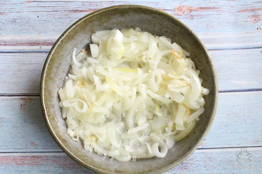 2. Лук чистим, режем не очень тонкими полосками и жарим его до мягкости, на сковороде с разогретым маслом.