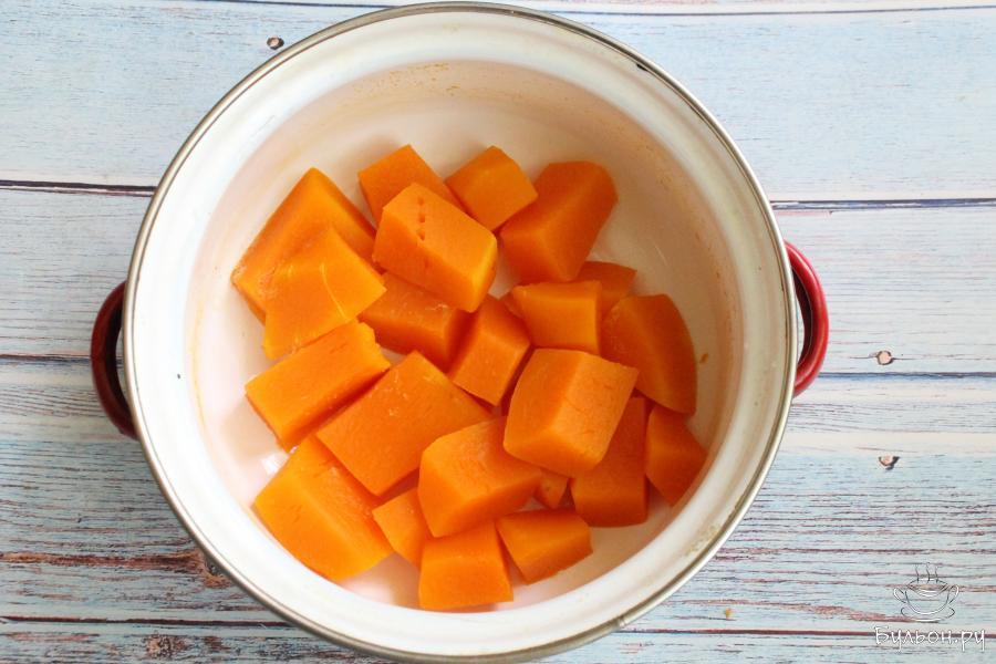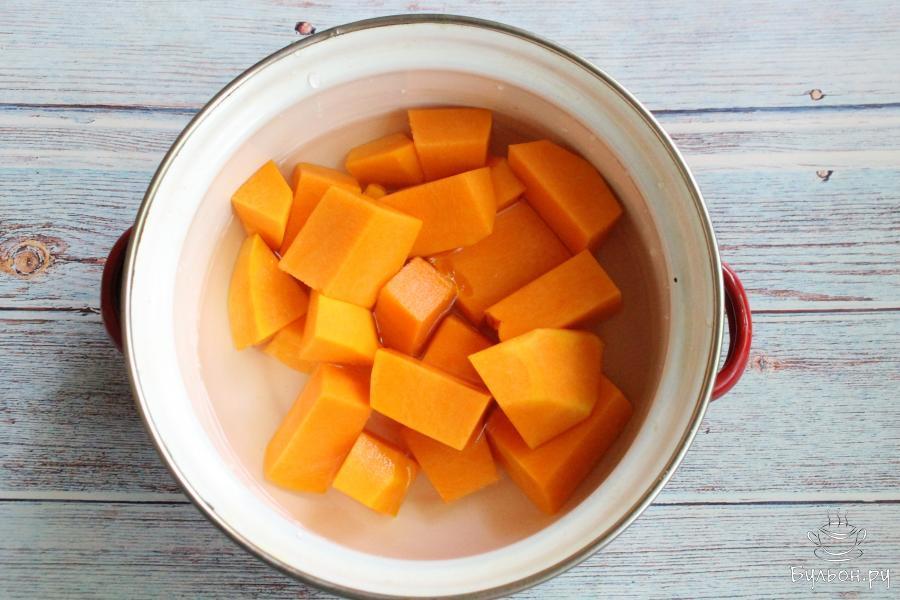 1. Тыкву почистить от кожуры. Нарезать тыкву крупными кусочками. Выложить тыкву в кастрюльку и добавить воды.