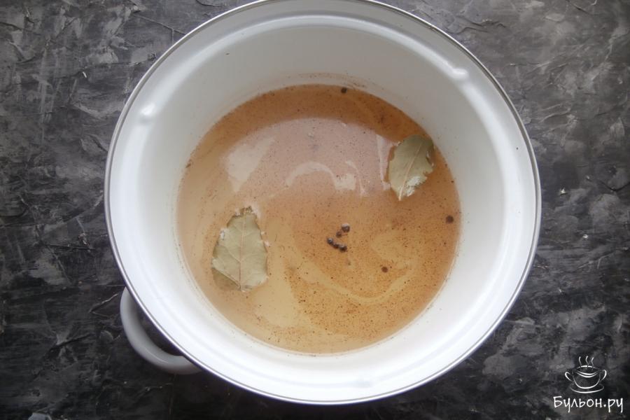 5. Эту воду также вылить в кастрюлю, всыпать сахарный песок и каменную соль, добавить перец горошком, корицу, пару лавровых листиков. Довести все до кипения, влить яблочный уксус.
