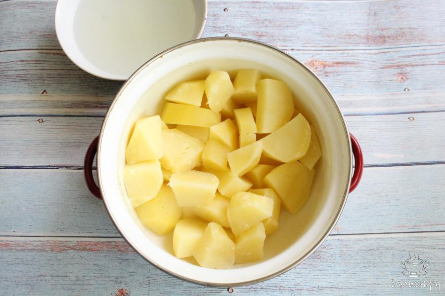 1. Картофель почистить, промыть, нарезать не очень мелкими кусочками. Залить картофель водой и поставить его на огонь. Сварить до готовности, примерно 15-20 минут.