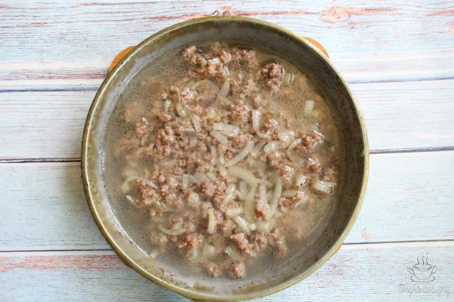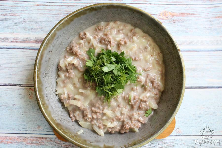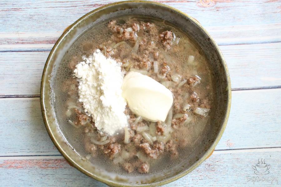 9. Добавить в сковороду сметану и муку. Постоянно помешивая, довести массу до кипения. По желанию, можно жидкость выпарить подольше.