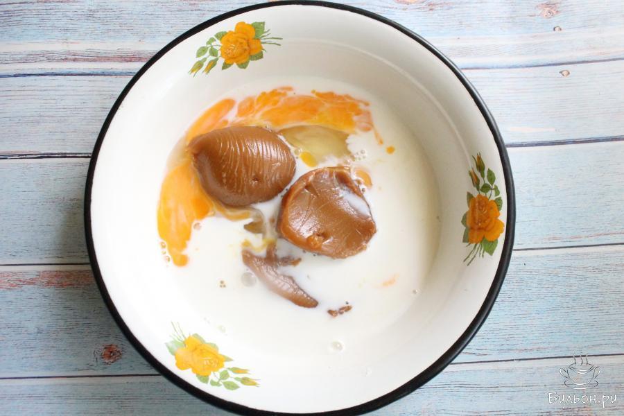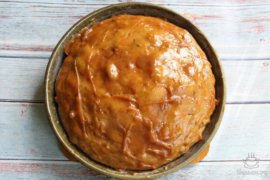 8. Горячий пирог смазываем сгущенкой. Если сгущенка очень густая, то ее можно разбавить пресным молоком (100 мл.), разогреть и этим кремом полить пирог.