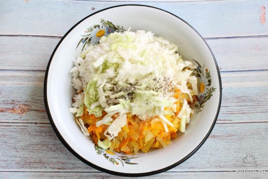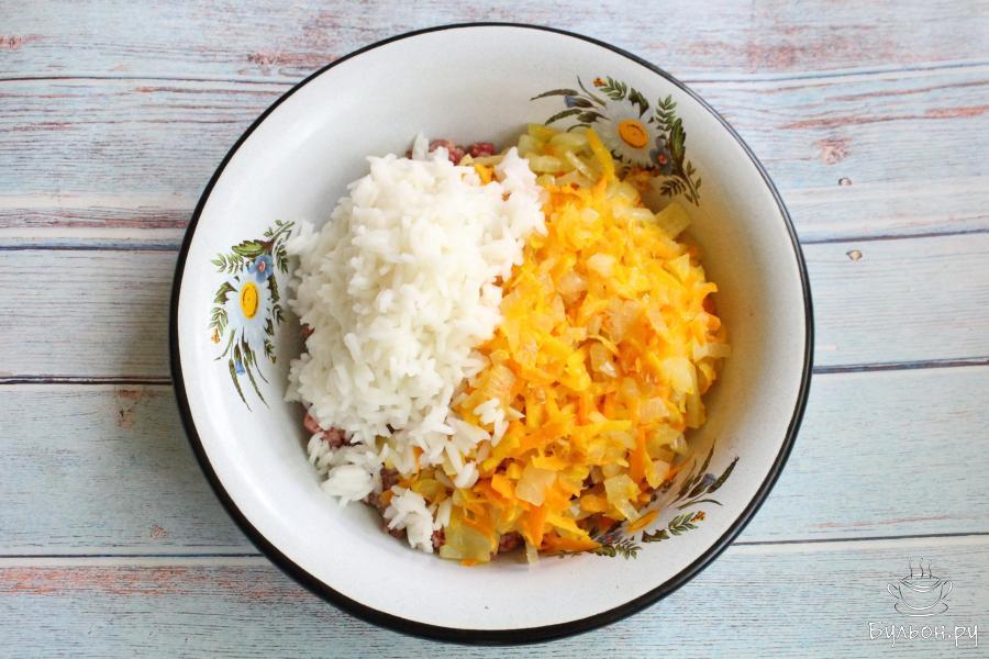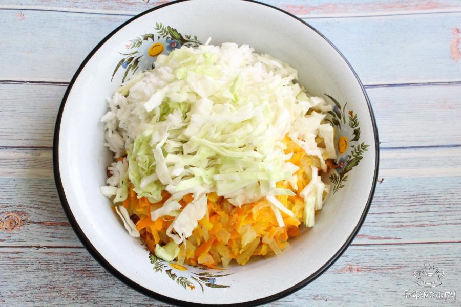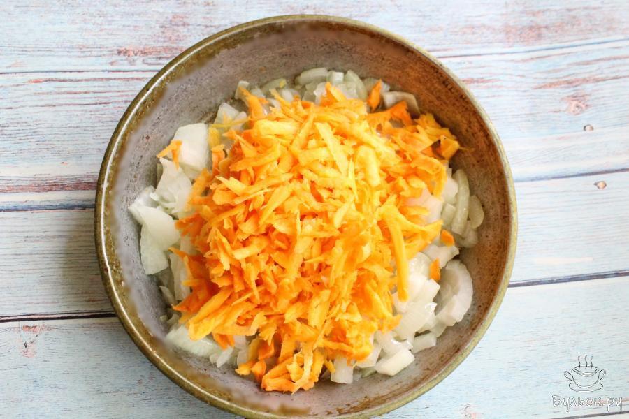 4. Морковь почистим, промоем, перетираем через крупную терку, добавим к луку и жарим овощи еще несколько минут. Помешиваем.