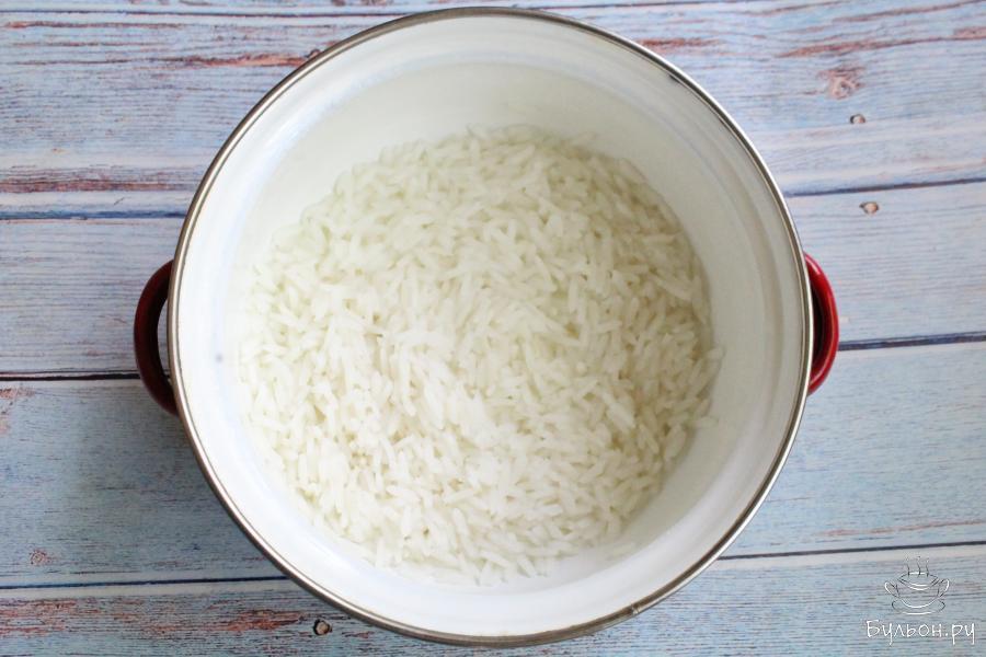 1. Рис промоем, добавим 300 мл. воды и поставим его вариться до полуготовности, 10 минут. Если вода после варки останется, сливаем ее.