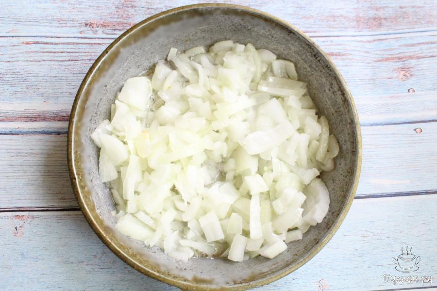 3. Лук почистим, промоем, нарежем не очень мелко и обжарим его несколько минут на сковороде с разогретым маслом.