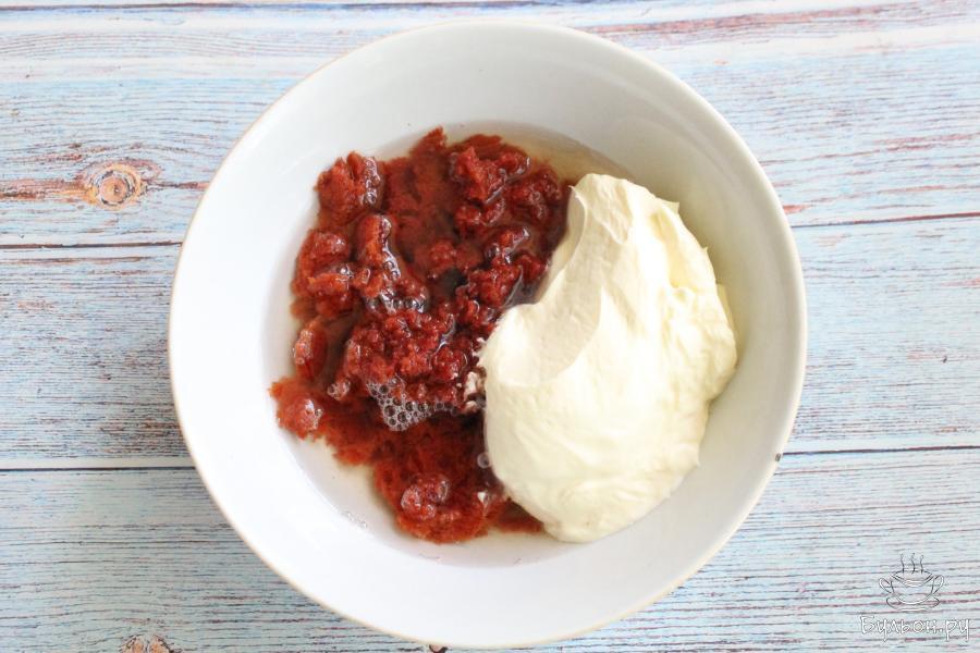 9. Для соуса: смешиваем томатную пасту, сметану и 150 мл. воды. Заливку можно немного посолить, это по желанию.
