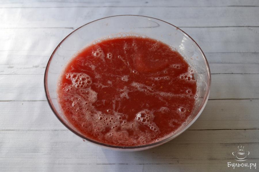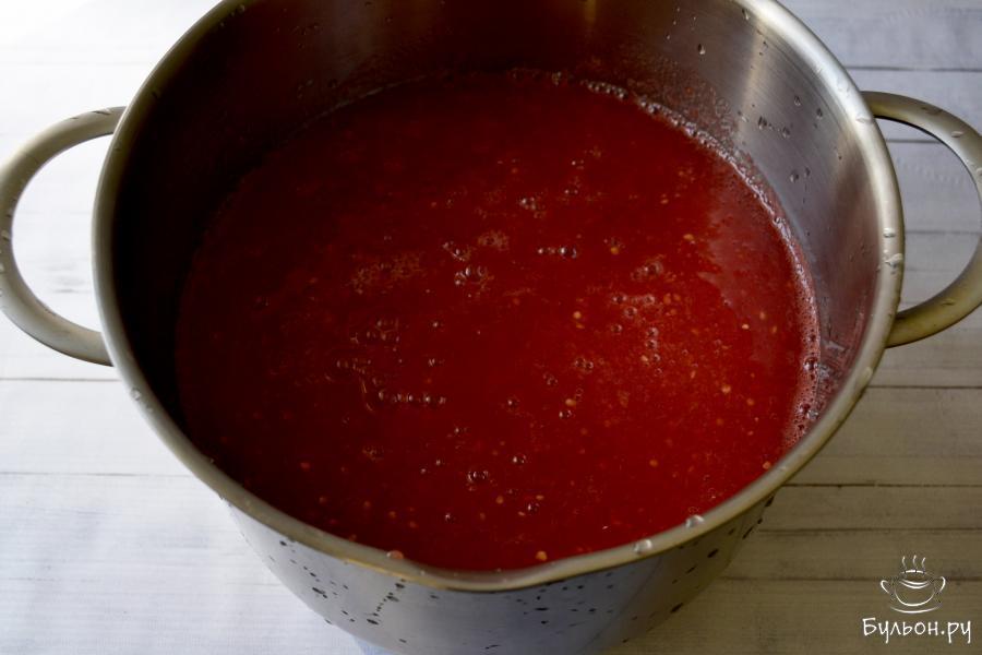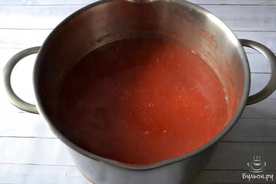 7. Прокипятите томатный сок на слабом огне в течение 10-15 минут. Снимите пену, которая появится во время кипения сока.