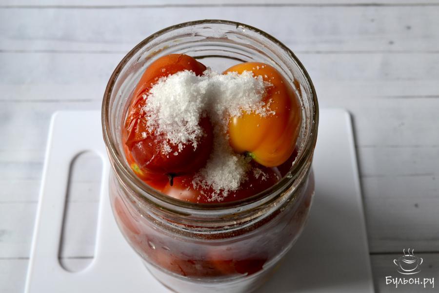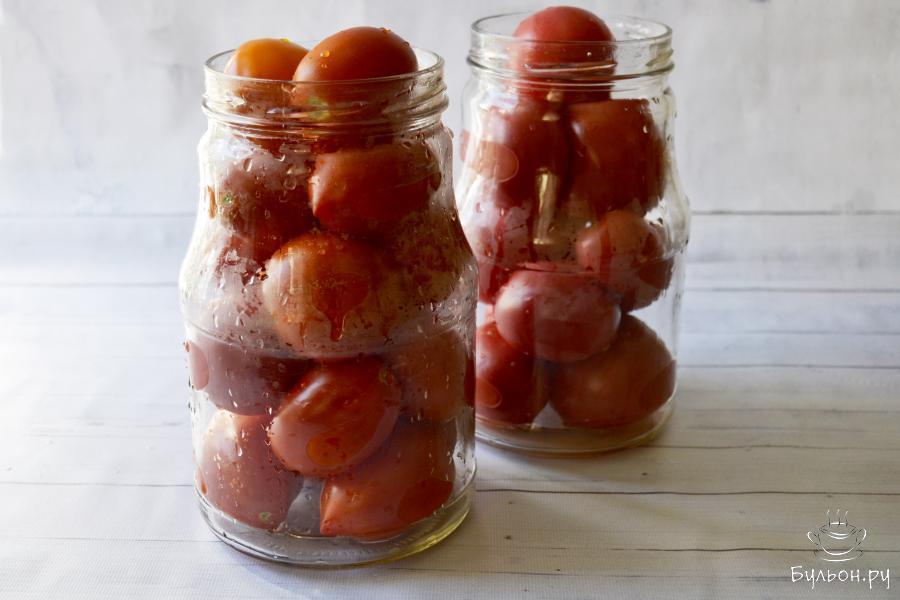 5. Банки и крышки тщательно промойте горячей водой с содой. Плотно заполните банки небольшими помидорами.