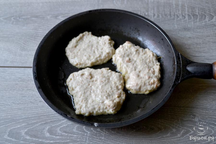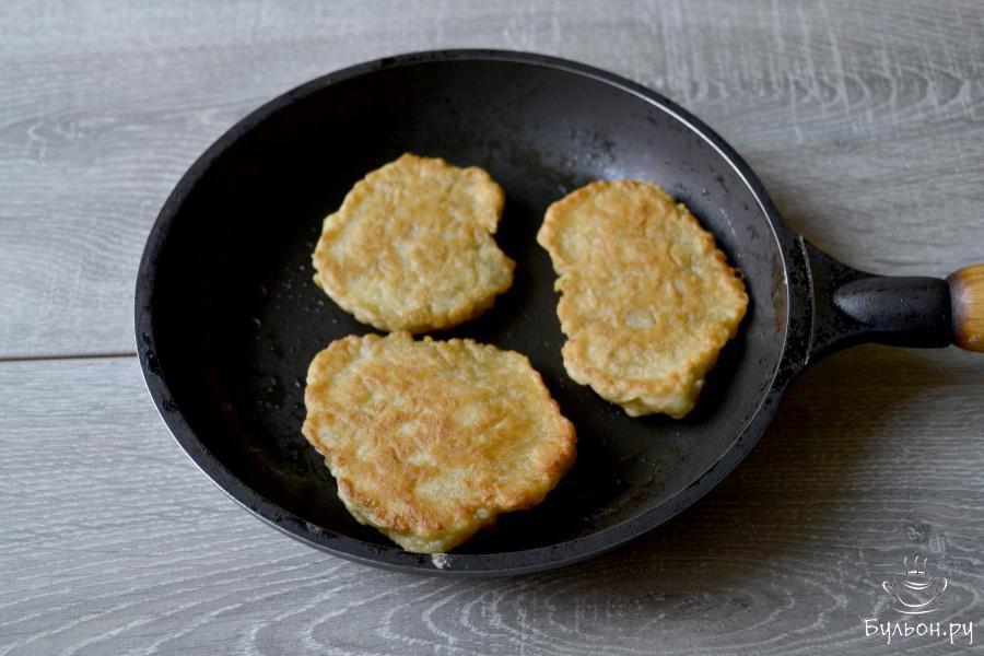 7. Разогрейте сковороду с растительным маслом и столовой ложкой выложите тесто. Обжаривайте на слабом огне, под крышкой, до румяной корочки.