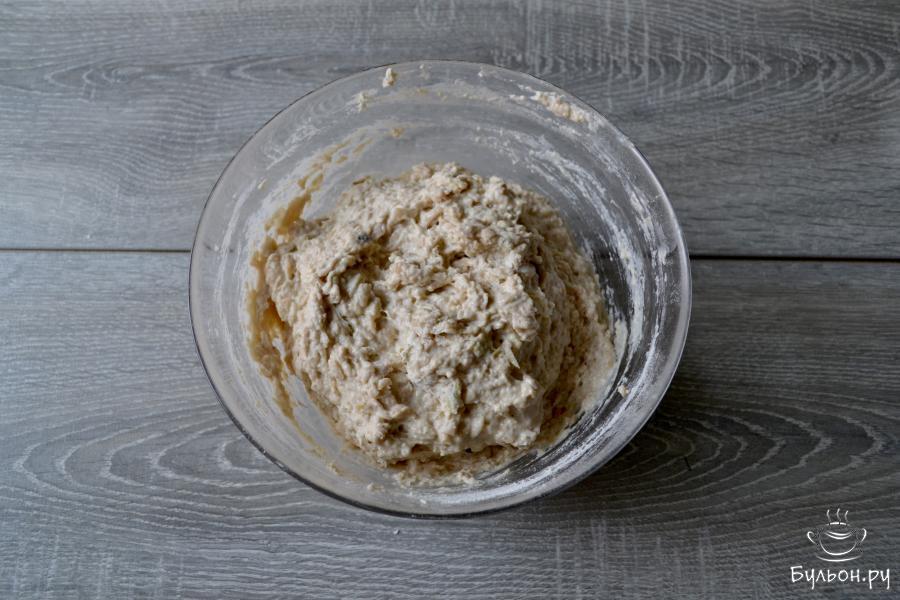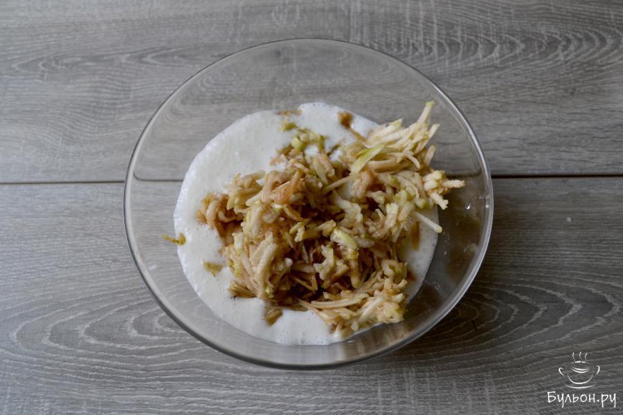 6. Перемешайте. Должно получиться довольно густое тесто. Муки может понадобиться больше или меньше, чем указано, это зависит от сочности яблок и густоты кефира.