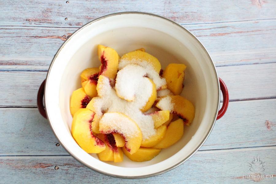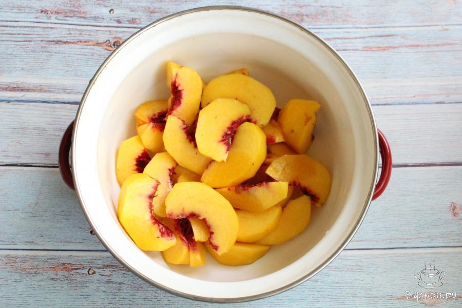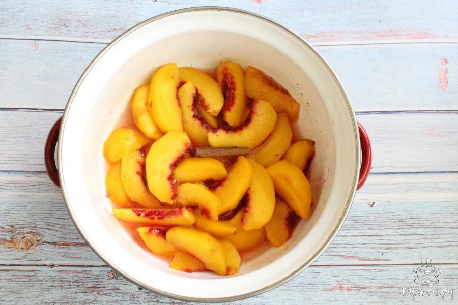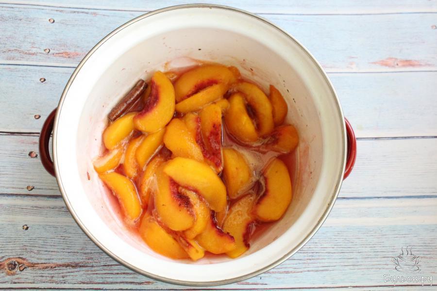 5. Добавляем к персикам половину палочки корицы. Доводим персики до кипения и убираем с огня. Даем варенью полностью остыть.