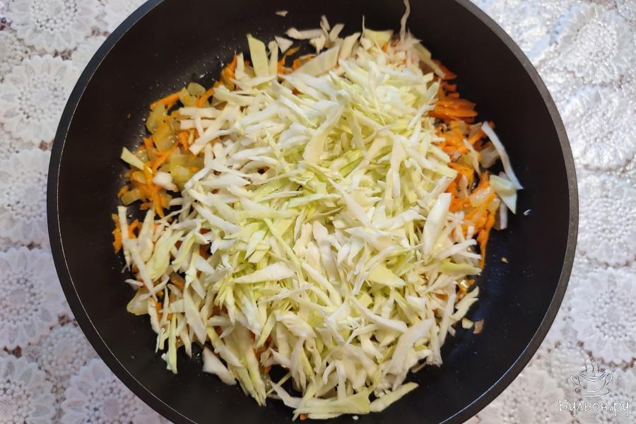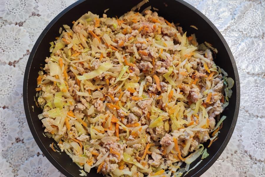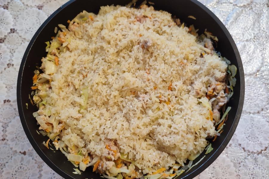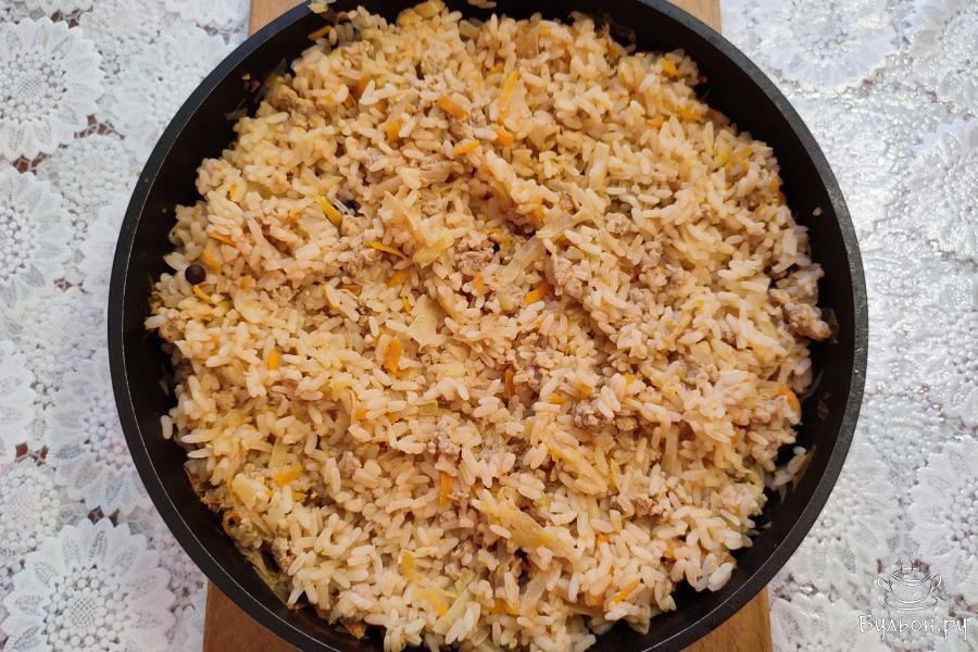 6. Накрыть сковороду крышкой и тушить на небольшом огне, до готовности, 25-30 минут. Рис с фаршем и капустой готов. Подать горячим.