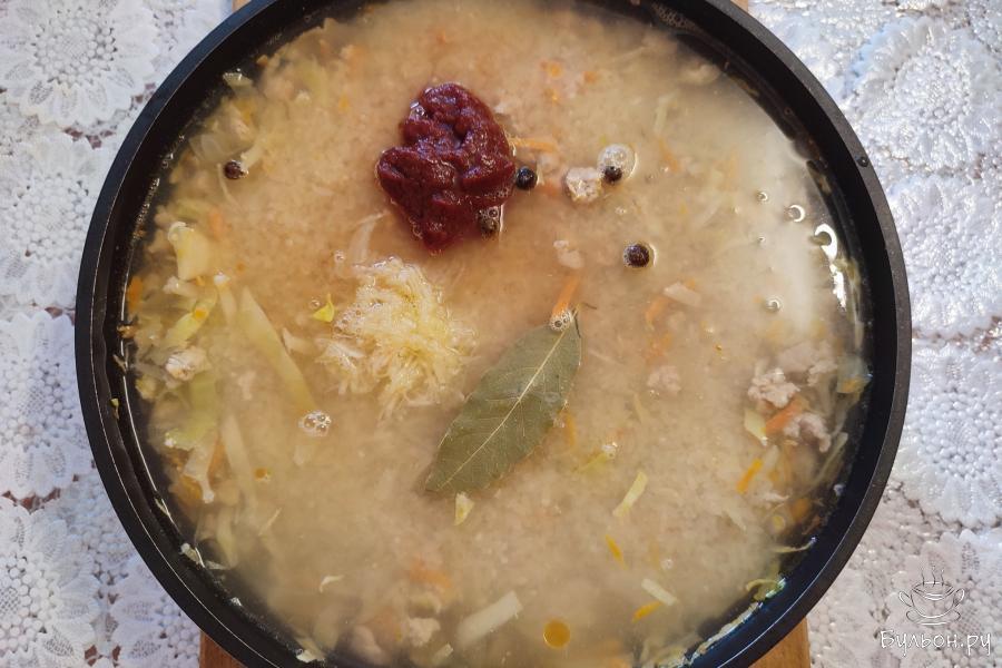 5. Налить воду, посолить, положить лавровый лист, душистый перец, томатную пасту и измельченный чеснок. Размешать.