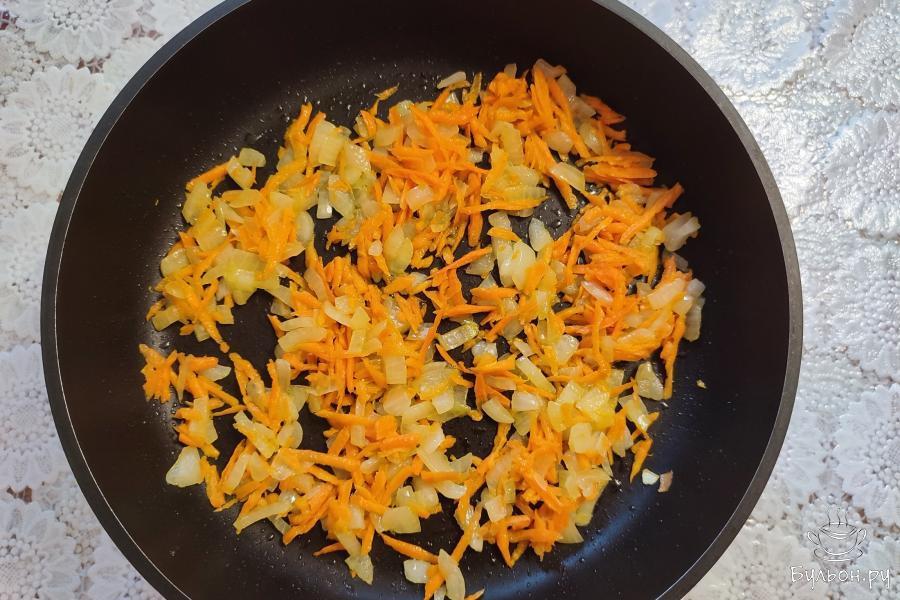 1. Овощи почистить. Лук нарезать кубиком, морковь потереть на крупной терке. На сковородке разогреть масло. Поджарить лук, до прозрачности, несколько минут. Добавить морковь, жарить до мягкости моркови.