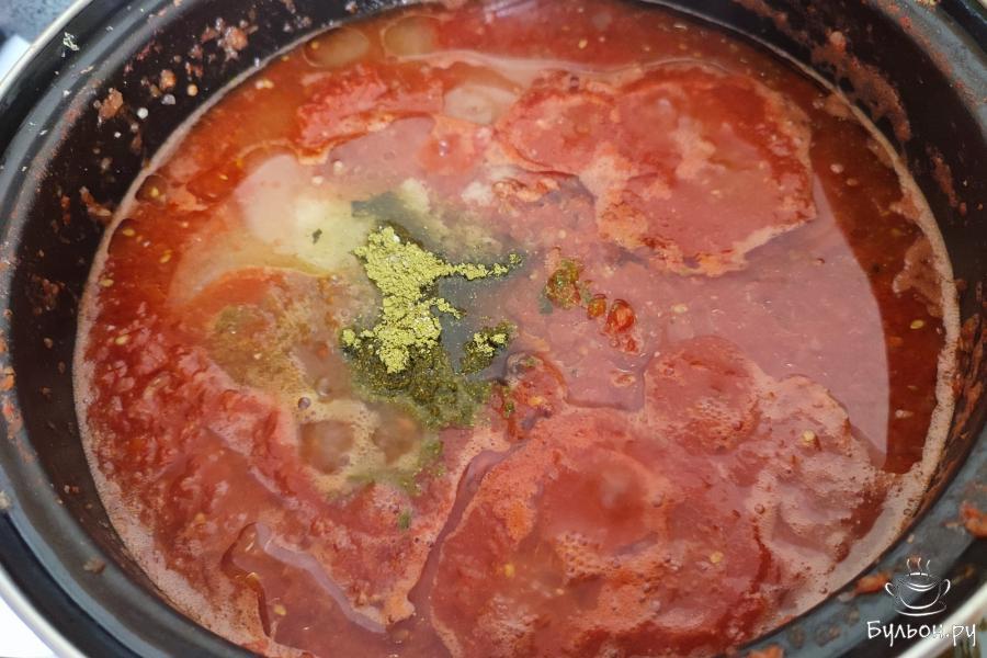 4. Затем добавить в кастрюлю сахар, соль, масло и хмели-сунели. Варить соус 20 минут, крышкой не накрывать.