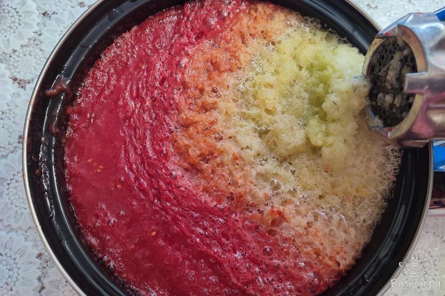 2. Промытые помидоры разрезать на 4 части, измельчить на мясорубке с мелкими отверстиями. Также измельчить лук, чеснок и сладкий перец. Поставить на огонь закипать.