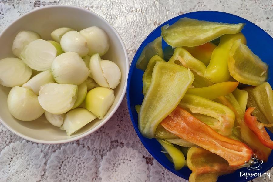 1. Помыть, почистить лук, чеснок и сладкий перец. Нарезать на части, чтобы можно было измельчить в мясорубке.