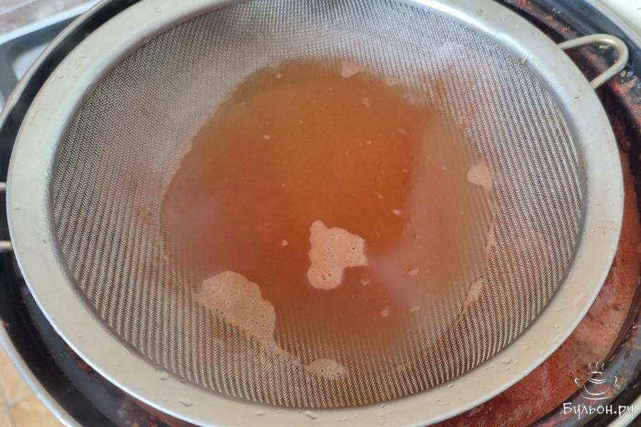 3. После закипания поставить на кастрюлю с соусом сито и удалить лишний сок. Таким образом сократится время на уваривание соуса.