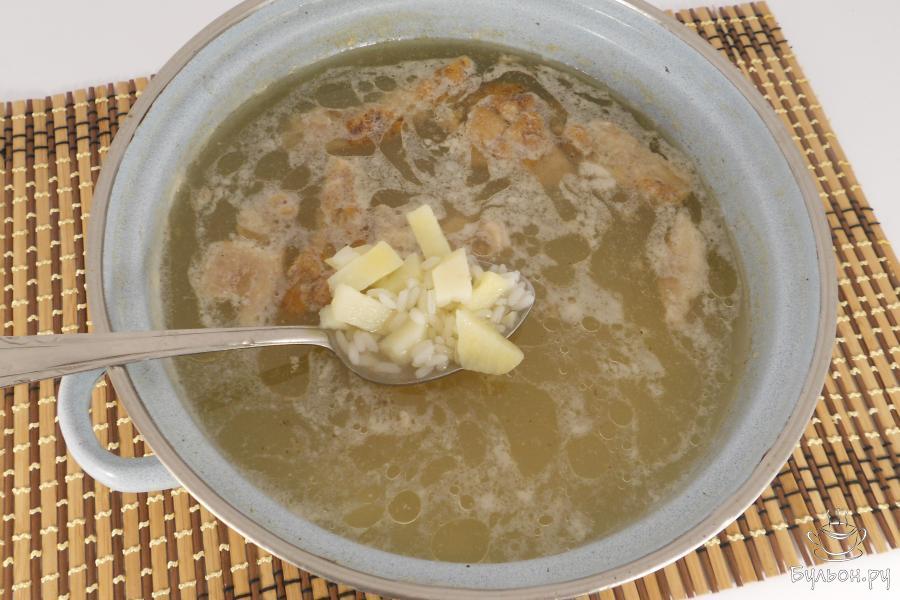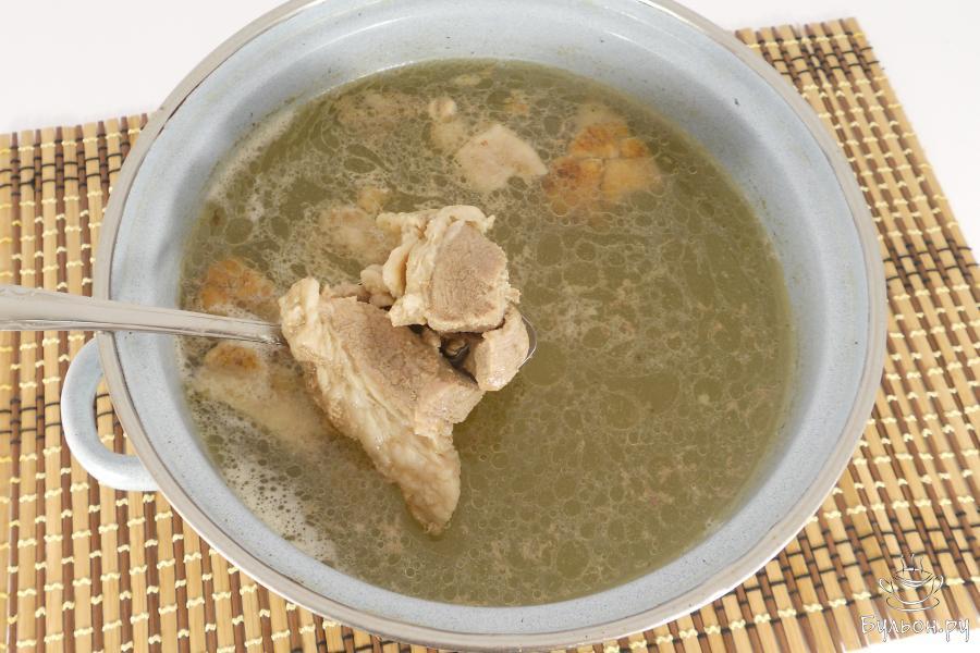 1. Мясо порезать кусочками, поместить в кастрюлю, залить водой. Довести до кипения, убрать пену, бульон посолить и варить свинину на небольшом огне около 30 минут.