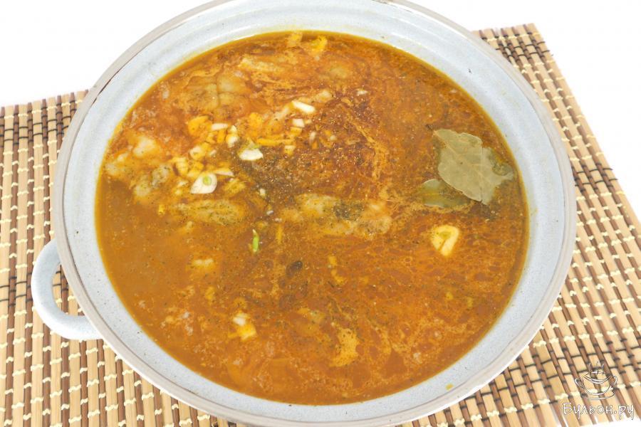 8. Содержимое сковороды выложить в кастрюлю, добавить приправу, лавровый лист и измельченный чеснок. Кипятить суп 5-10 минут, после чего выключить газ и дать рассольнику настояться 15 минут.