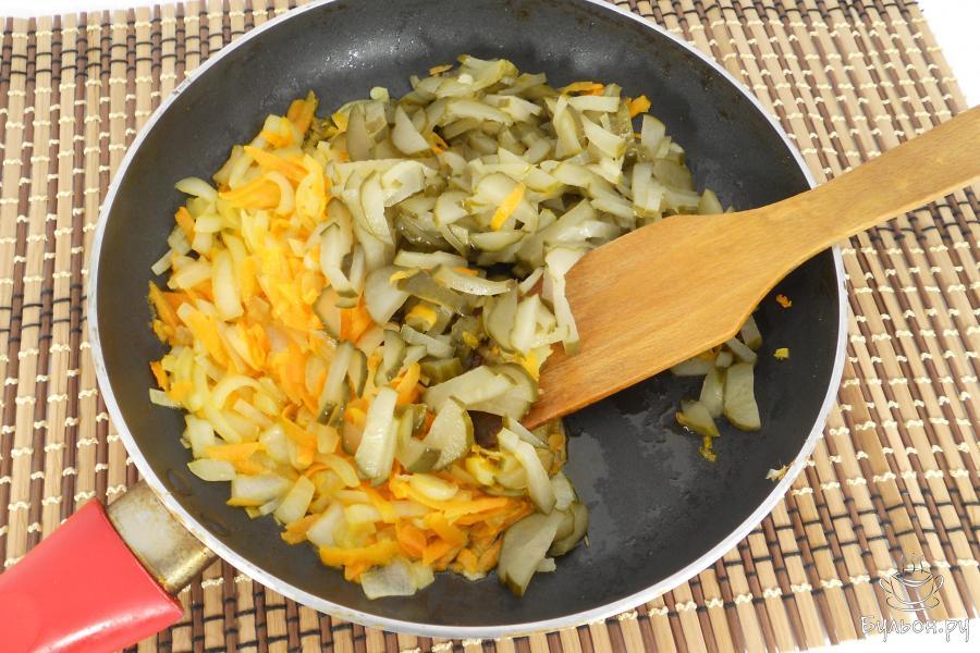 6. Лук репчатый порезать кусочками, морковь натереть на крупной терке. Обжарить овощи на растительном масле до мягкости, добавить к ним огурцы. Обжаривать все вместе на среднем огне минут 6-7.
