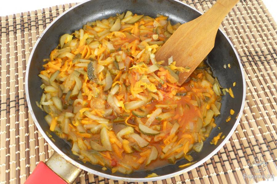 7. Далее добавить томатную пасту, влить рассол и немного бульона из кастрюли. Заправку кипятить на медленном огне 4-5 минут, посолив и всыпав сахар.