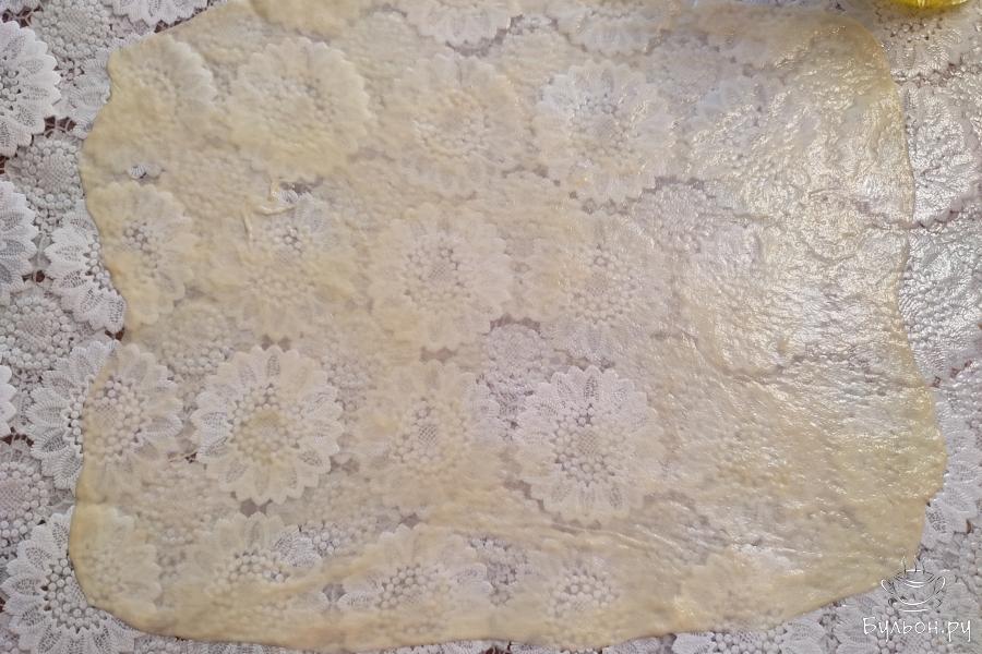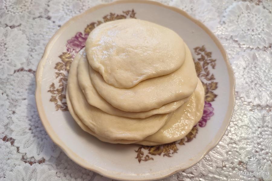 10. Таким образом должна получиться стопка промасленных лепешек. Накрыть полиэтиленом и оставить на 10 минут. Затем лепешки необходимо растянуть максимально тонко. Удобнее всего это делать на силиконовом коврике или клеенчатой скатерти.