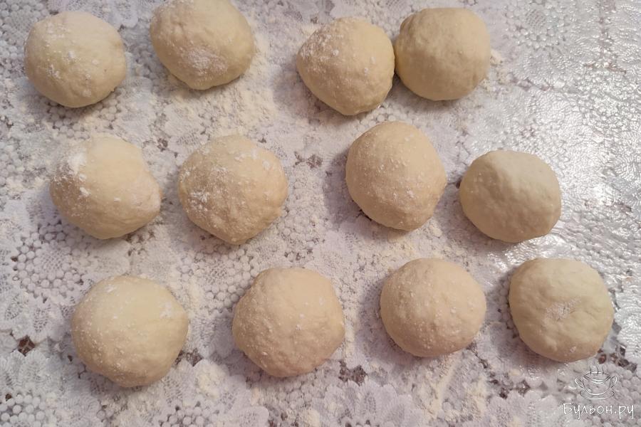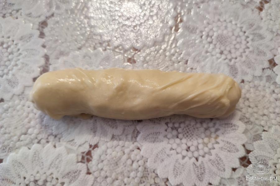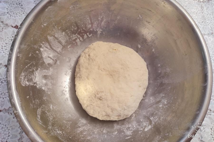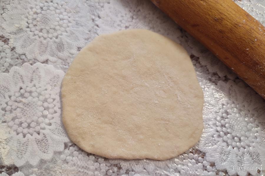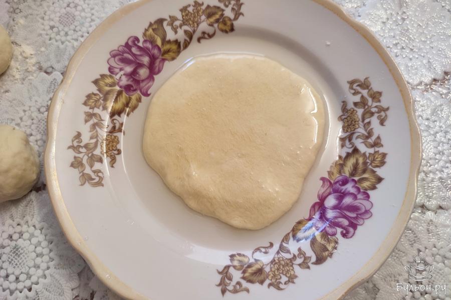 11. Налить на рабочую поверхность немного масла. Равномерно его распределить по поверхности стола. Выложить лепешку на стол. Смазать руки маслом. От середины к краям аккуратно разглаживающими движениями растянуть тесто.